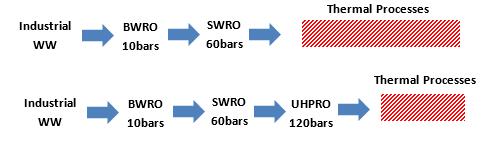 With recent developments on RO membrane market, ultra-high-pressure reverse osmosis (UHPRO) spiral wound membranes have been developed capable of withstanding 1800 psi (120 bar). UHPRO membranes enable the concentration of saline streams up to 130,000 mg/L total dissolved solids (TDS) for NaCl and 150,000 mg/L for Na2SO4 which means a 50% decrease in brine volume comparing to the standard types of membranes.
