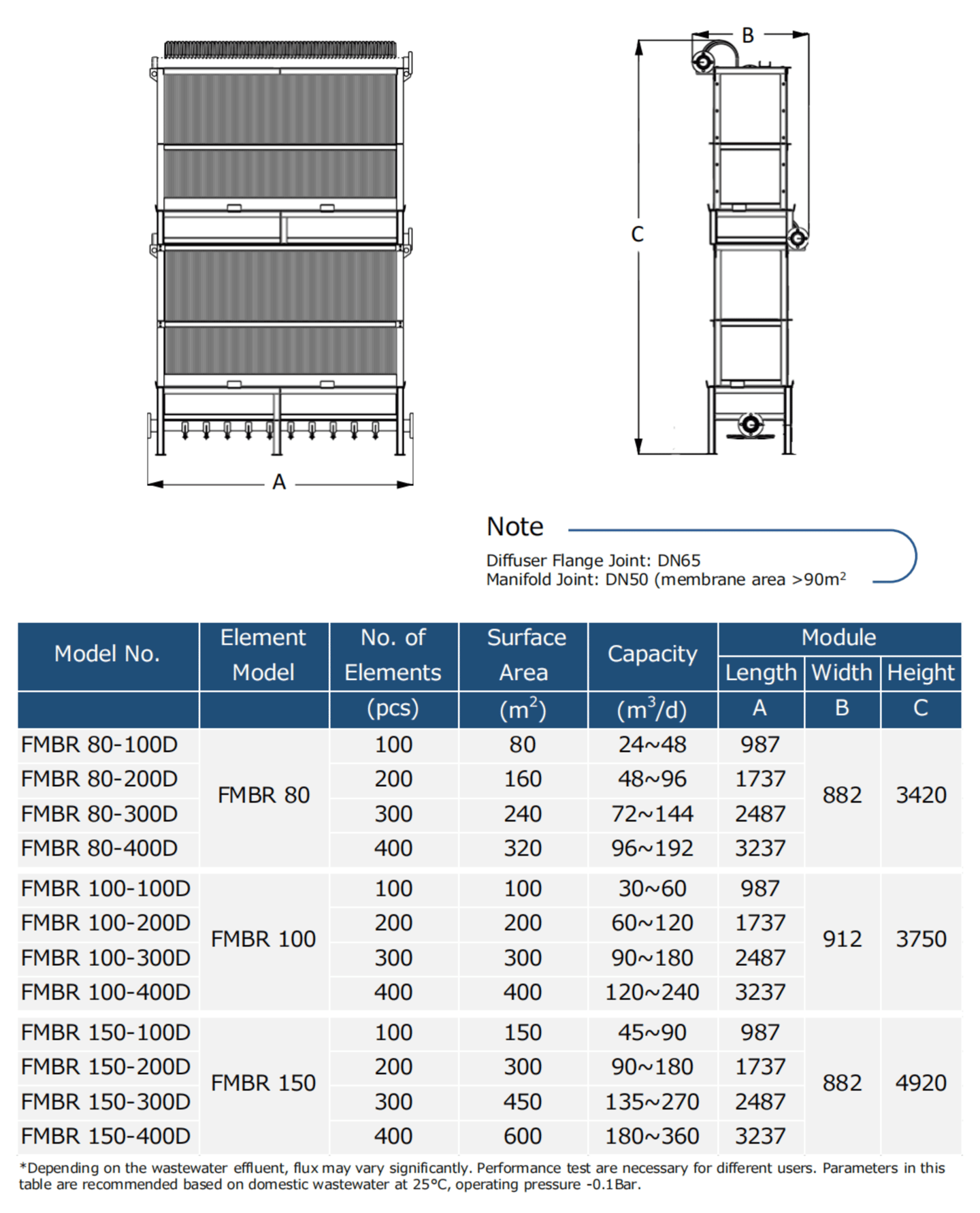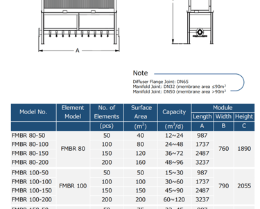 FSMBR 16 Single Deck Flat Sheet Membrane 150 Cassettes (Model No. FSMBR 16-150), FMBR PVDF Series is a high-flux Flat Sheet MBR membrane delivering excellent permeability, fouling resistance, stability, and elimination effectiveness. Structured with PVDF (permanently hydrophilic polyvinyl difluoride) has the advantage of dry storage. FMBR PVDF Series membranes can be used for a wide variety of treatment applications such as industrial and domestic wastewater.